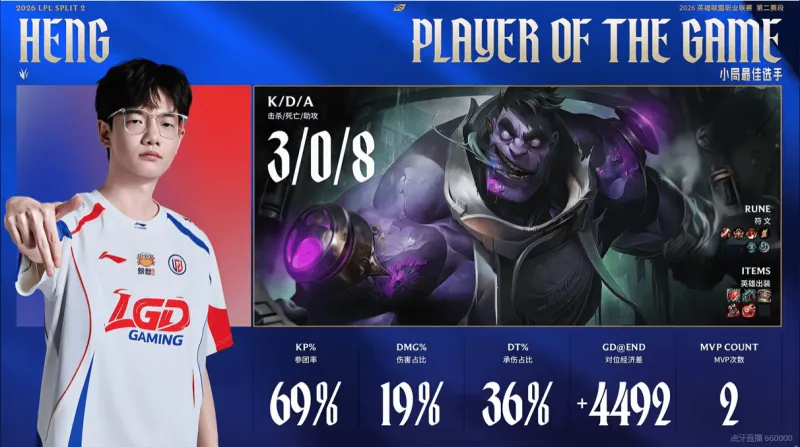 虎扑04月12日讯 在LGD对阵OMG的第三局比赛中,Heng使用蒙多打出3/0/8的KDA数据,团战中多次承担前排与拉扯作用,为队伍创造良好输出环境。凭借稳定的资源把控与关键团战中的承伤与带动,成功帮助队伍完成让一追二,拿下本局MVP